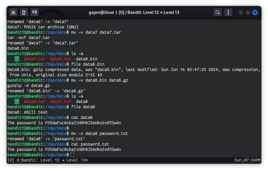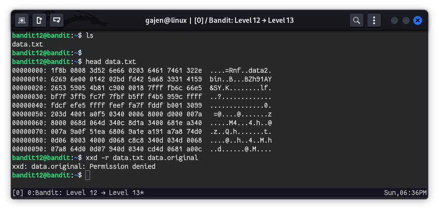 The password for the next level is stored in the file data.txt, which is a hexdump of a file that has been repeatedly compressed. For this level it may be useful to create a directory under /tmp in which you can work. Use mkdir with a hard to guess directory name. Or better, use the command “mktemp -d”. Then copy the datafile using cp, and rename it using mv (read the manpages!)