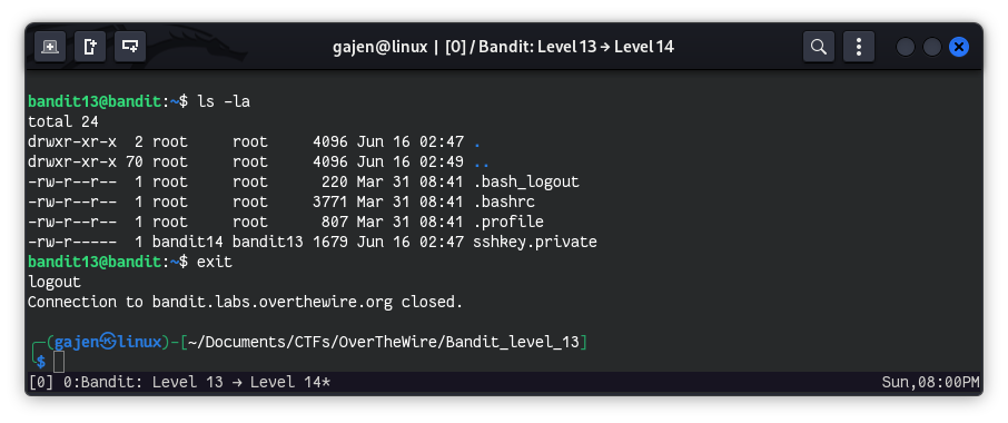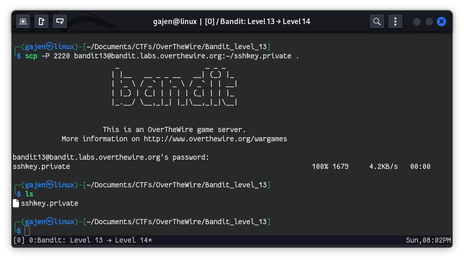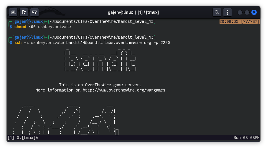 Now that we have the SSH key for the next level user bandit14, we can log in using it after giving appropriate permissions to the SSH file: