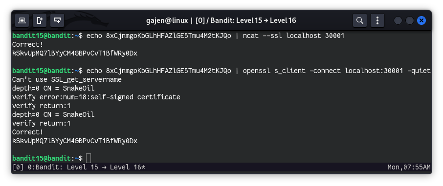 echo 8xCjnmgoKbGLhHFAZlGE5Tmu4M2tKJQo: This command prints thebandit15password.|: The pipe operator redirects the output of theechocommand to the next command.ncat --ssl localhost 30001: This command usesncatto connect to port 30001 on localhost with SSL encryption and return the password.