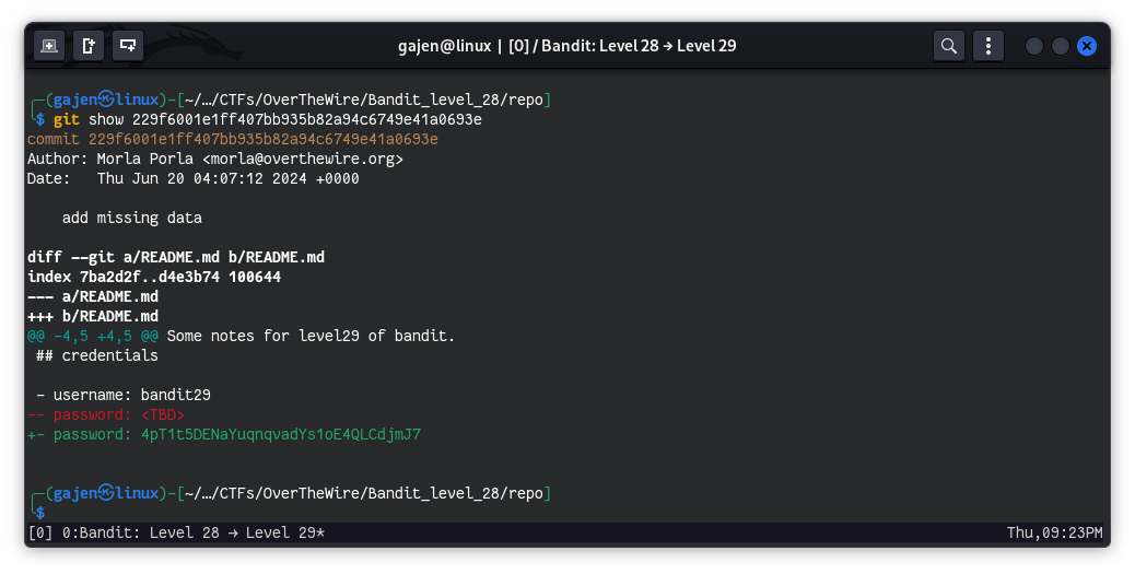This level is similar like previous level, we are again dealing with a git repository located at ssh://bandit28-git@localhost/home/bandit28-git/repo via port 2220. The password for the user bandit28-git is the same as for the user bandit28. Let’s construct the command to clone the repository to our system.