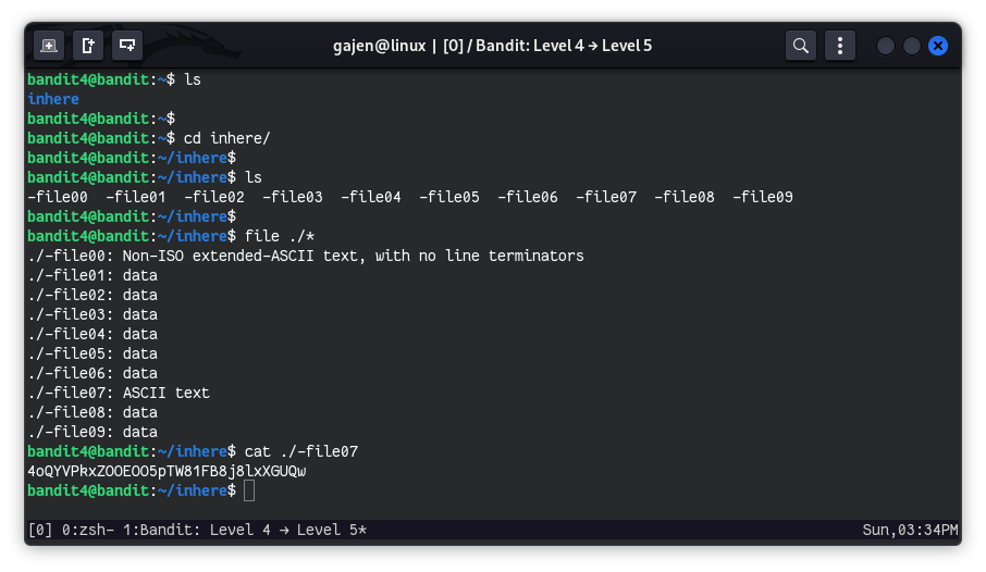 The password for the next level is stored in the only human-readable file in the inhere directory. Tip: if your terminal is messed up, try the “reset” command.