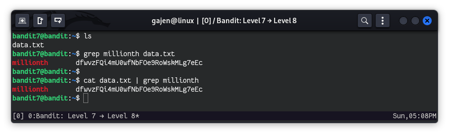 As we know, The password of the next level is at next to the word millionth. So, we can use the grep command to match the line containing the word millionth and retrieve the password.